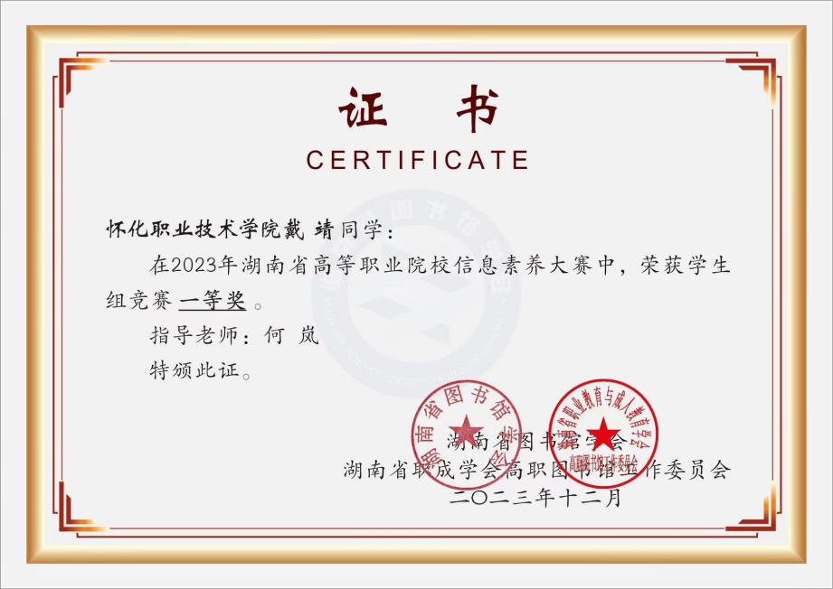 在2023年湖南省高等职业院校信息素养大赛中,学院何岚老师指导的戴靖同学获一等奖,尹爱获同学三等奖,刘洁老师指导的吴增樱学生获二等奖,左程远、刘俊宇同学分别获三等奖。