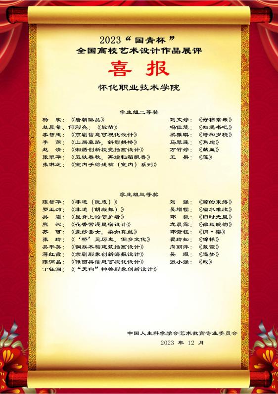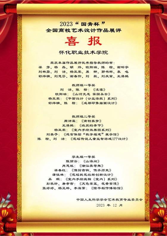 在2023年国青杯全国高校艺术设计作品展评中,梁芳、杨磊等15位老师被评为优秀指导老师。教师组获一等奖4项,二等奖5项。学生组获一等奖7项,二等奖13项,三等奖19项。
