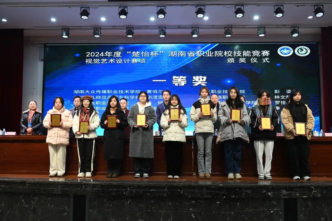 在2024年“楚怡杯”湖南省职业院校技能大赛视觉艺术设计赛项中,学院杨磊老师指导的彭姿同学获一等奖,杨磊老师获优秀指导老师。陈橙老师指导的刘倩同学、袁也老师指导的吴静同学获二等奖。