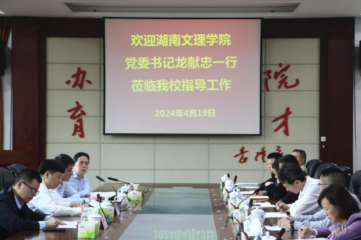 4月19日上午,湖南文理学院党委书记龙献忠一行来我校调研指导工作。座谈会在学校多功能厅会议室召开,校党委副书记、校长刘学文主持,校领导张云龙、肖宪龙、李亚玲出席,相关部门负责人参加。