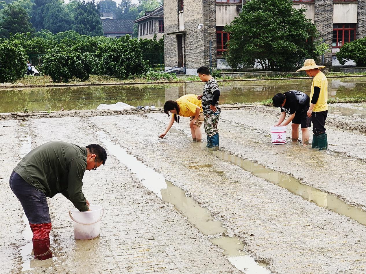同学们以小组为单位迅速行动起来,大家提着桶子,手捏种子材料,在老师的指导下有序进行水稻播种流程。期间,学生们相互交流、分享经验,共同进步的学习氛围浓厚。