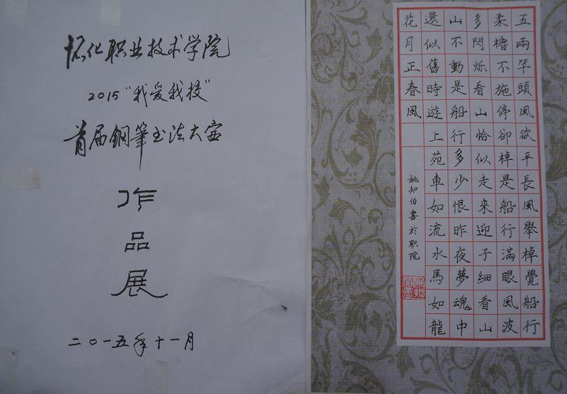 正值我院第十届隆平文化艺术节之际,为了更好地弘扬中华传统文化,传承笔墨书香,培养学生对汉字书法艺术的兴趣,提高我院学生对承载数千年中华文明的汉字的重视程度,由我院书法协会主办的2015“我爱我校”钢笔书法大赛经过一个月筹备,成果展于11月10日——14日在图书馆、教学楼门口展出。
