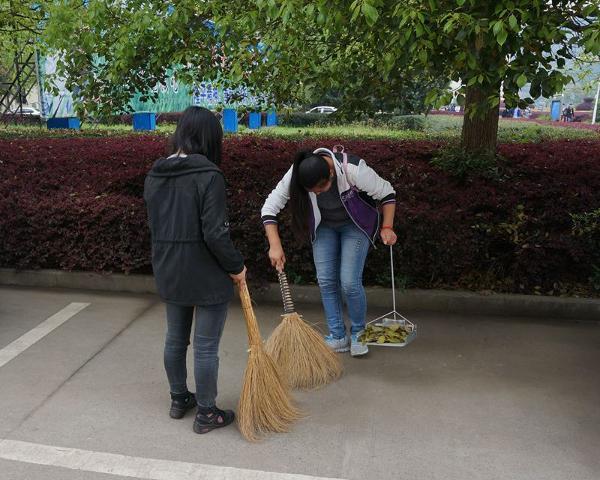 院学生会劳卫部成员仔细打扫校园卫生,不留一个死角,不留一片树叶